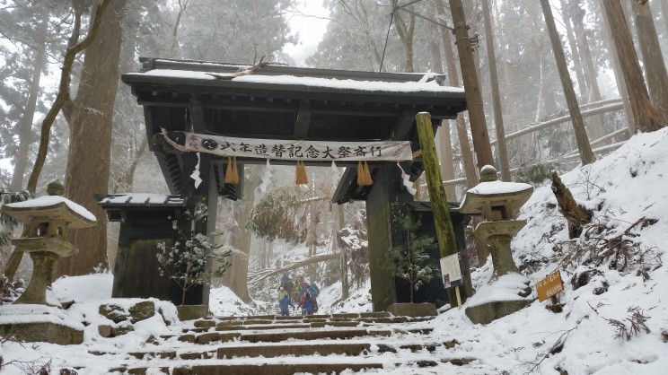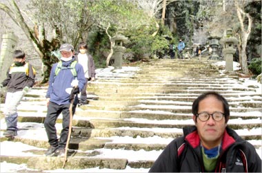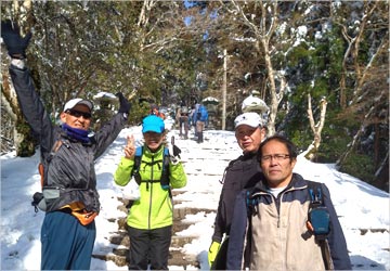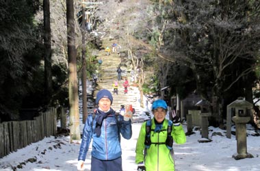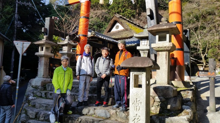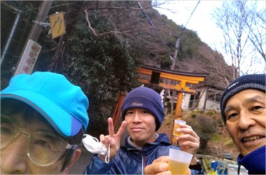 本日は毎年恒例の愛宕山初詣が開催されました。 9時30分にJR嵯峨嵐山駅集合で5名のメンバーが揃いました。 しかし肝心の幹事である内村氏いなくスタートしました。 道中T字路で毎年なら清凉寺方面へ曲がる予定が大覚寺方面へ右折する。 皆さん少し気づきながらも近道?と楽しく進むも段々と別の山が近づいてくる。 これはおかしいと折り返して道補正をしてようやくいつもの保存家屋道へ戻ることができました。 清滝トンネル手前の鳥居で記念撮影を行い、清滝方面へ行く予定が全員、六丁峠方面へ。 三橋氏と中島氏はジョグ、残りは徒歩で愛宕山登山口へ向かいました。 愛宕山登山口到着は約7Km 11時50分と例年になく遅く、登山客の姿もほとんど見られない。 登り口の温度計は7度と高く、ようやく登山開始です。 道中は下山客の方が多くいつもと違う光景でした。 各自各々のペースで登り13時40分頃に全員境内がある山頂へ到着することが出来ました。 休憩室には幹事の内村氏がおられ途中で追い抜かれていたようでした。 山頂では下山客のせいかまばらでした。 皆さん、到着後は御神酒を頂いたり、御札を購入されたりと山頂を満喫されておりプチ宴会も開始?? 境内前の温度計を確認すると「氷点下2℃」寒さはマシです。 昼食後、記念撮影をして下山するも幹事の判断で月輪寺方面は道が悪いとの事で同じルートで下山をすることになりました。 下山時、三橋氏がいない!!皆さん既に下山されたということで先に進む。 プチ宴会をされたせいか?ほろ酔い気分でペースもゆっくりと楽しまれていました。 下山後でも三橋氏が見つからず後ろ?前?と気になりながら連絡もつながらずで皆さん心配されていました。 17時30分頃、JR嵯峨嵐山駅に到着することが出来ました。 今日は波乱万丈なことがありましたが参加されました皆さん、お疲れ様でした。
