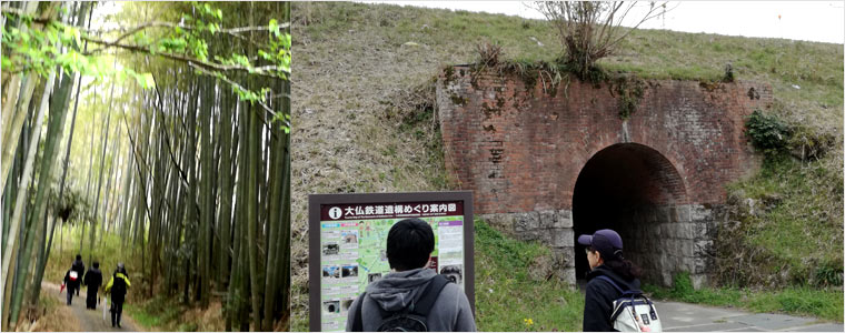 加茂駅近くの大仏鉄道遺構の「ランプ小屋」〜「跨線橋」〜(開通式典が催された興福院)〜「観音寺橋台」〜「梶ヶ谷隧道(けっこう狭い)」〜「赤橋(橋桁の一部は木)」〜昼食「城山台公園(大仏鉄道公園)」〜「松谷川トンネル」〜「黒髪山トンネル跡」〜(ドリームランド跡、鴻池運動公園)〜終点(近鉄奈良駅)