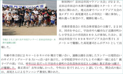 年内活動計画の報告・岡ちゃんのストレッチの後、園内「ふれあいの森」コースと松本コーチ・オリジナルコースに分かれ練習を行う。オリジナルコースでは30℃/湿度の高い中、公園から宇治田原方面に3K、そこから宇治川方面のアップダウン片道2K・往復4Kのコースを1〜3回、皆さん大粒の汗を流しながら秋の大会に向け走り込まれていました。全体を引張った平林(克)のスピード違反に皆さん追従しようと体力を使い切り、相当疲れきった方も数名おられました。前日の40K走に参加、今日もオリジナルコースを他のメンバーと一緒に走り込まれていた鳥塚・小川・藤村さん本当に元気ですね〜☆疲れた時はゆっくりペース及び途中で止めることも必要です。体調と相談しながら走りましょう。皆さんお疲れ様!(参加者30名) |