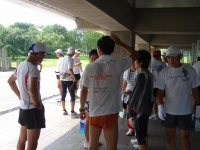 本日の練習会は約30名が集まり、園内、園外に分かれて行いました。園内組は競走部との合同練習でふれあいの森1Kmコースを1〜2時間ほど走り20名の参加者でした。園外組は2グループに分かれての練習会でした。三橋氏、斉藤氏は黄檗公園までの20Km走、芝田氏率いる8名は宇治十帖のスタンプラリーの健脚コースを走り17〜18kmを2時間で走りました。本日は大変涼しくとても走りやすい気候でした。