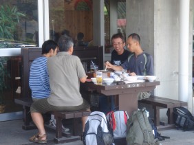 本日は年に1度の皆さんお楽しみのJC合宿でした。昨年は台風の影響で中止となった為2年ぶりです。参加者も男性15名、女性5名と大いに盛り上がることが出来ました。初日は各車4台、現地7:00出発でしたが3連休中日とあって思った以上に到着に時間がかかり11:00集合となりました。早速、着替えて11:30よりスタートで距離計測を兼ねて全員ジョグで5Km地点まで走りました。ここで昼食組と自主練習組に分かれました。昼食組は後半戦に向けて宿に帰宅(10Km)、自主練習組はさらに片道5Km余分に走り昼食、帰路(20Km)です。(岡野氏、山下ひ氏、岡田氏、林氏)
