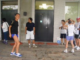 本日の練習会は約35名の参加者でした。体育館の横のプールでは暑さをしのぐため大勢のお客さんの中、異様な集団です。いつもの如く園内組、園外組、競走部に分かれての練習会です。園内組は冒険の森コースを約8名で1時間ほど練習して終了です。園外組は??コースですが約10名で練習です。競走部はふれあいの森コース1Kmを1.5時間走を行い、400m流し、400mジョグを1セットとし、3回行って終了です。