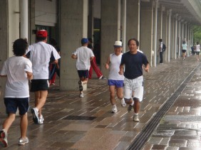 | 本日の練習会は開始時間前の豪雨により参加者が約15名と少なかったのですが各々個々のペースで走ることが出来ました。本来ならクラブ内駅伝を企画していましたが天候と人数でグループランに変更です。まず内村氏によるストレッチ後、小雨が降っていることで最初の10分間は体育館軒先での練習です。雨が止み2.5Km駅伝コースを個々のレベルで1〜2時間練習を行いました。磯部氏、宮崎氏はコツコツと自分のペースで2時間走。斉藤氏、金崎氏は1時間45分走った後芝生で流しと皆さんいい汗をかかれていました。 |
