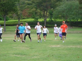 本日の練習会は約30名の参加者でした。残暑がまだまだ残るなか真夏でもあるかのような日差しでした。本日も園内、園外、競走部に分かれての練習会でした。園内組は約10名でふれあいの森コース1Kmを1時間程各々のペースで周回しました。園外組は約10名ですみません、本日もコースを聞いていませんでした。競走部は11名でふれあいの森400mコースを12周(5Km)×3本を走りました。最初の7周まではグループで走り残り5周はフリーランと言うスタイルで走りました。全体的な走力は夏場にスピード練習をしていないせいか少し落ち気味にも感じられました?(記)