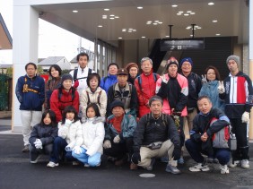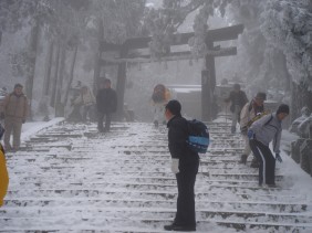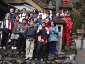 本日は恒例の冬のハイキング、愛宕山登山です。JR嵯峨嵐山駅に9:30集合で総勢21名が集まりました。登り口までは走り組と登山組に分かれて、走り組は3Kmオーバーを回り道をし山頂へ目指してスタートです。今年は例年に比べて気温が高いようにも思われましたがやはり山頂付近になると徐々に雪化粧で白くなり、7合目まで登ると辺りは雪山へと変身です。山頂の外気は氷点下0.5と低く、ストーブ部屋にお世話になり登られた方より昼食、お札さん購入とゆっくりし1:40に下山です。神社の階段は雪で真っ白、カニ歩きの集団も見ものでした。雪で滑りながらも皆さん無事に下山することが出来ました。 遅れましたが、クラブの皆さん「あけましておめでとうございます。本年もよろしくお願いします。」 |