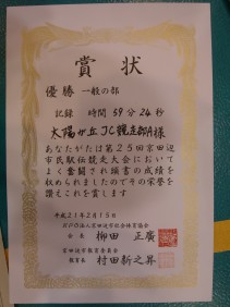 本日は京田辺市で「第25回市民駅伝競走大会」がありました。天候は晴れで少し暑い気味の中で大会が行われました。我がチームからは「競走部A、B」「集いA、B」の計4チームが出場し皆さん健闘されました。 特に競走部Aチームは去年の屈辱をバネとして最高のメンバー構成で編成することが出来ました。その結果、2位を突き放してダントツ1位で優勝することが出来ました。しかも区間賞は競走部Aチームより4人!! 第2区・・・平林克之氏、第3区・・・金田隆史氏、第4区・・・磯辺誠氏、第6区・・・平林克友氏ととても素晴らしい結果となりました。 他のチームも検討し競走部Bチーム・・・4位、集いBチーム・・・8位、集いAチーム・・・13位です。 皆さんのタスキを繋げることにより素晴らしい結果となり改めてチームが結束されたと思います。 結果は「大会結果」に掲載していますので皆さんのそれぞれの思いを思い浮かべながら次なる大会に備えましょう。 駅伝に出場されました選手の方、応援の方、駅伝幹事の方お疲れ様でした。 |