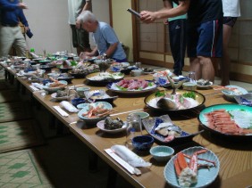 本日は年に一度のクラブ合宿で12名の参加者でした。小浜市総合運動公園に10:00現地集合でしたがお弁当の手配等で全員が集まったのは12:00前になりましたが10:00過ぎに到着した田中氏、杉本氏、山下氏は5Kmほどアップ。松本氏、小川氏、岡田氏、林氏は小浜より10KmのRUN。全員到着後、各々の走力で5〜10Km走り宿へ移動です。道中、宿より10Km手前で田中(俊)氏、杉本(岳)氏、林氏が雨の中を力走し、宿に到着した三橋氏、中島氏は往復10KmRUNと皆さんやる気満々です。 夕食では皆さん待ちに待ったお楽しみの超豪華料理で鯛、ひらめ、しまアジ、マグロ、あわび、イカ、甘えびと刺身三昧にサザエ、カニと申し分のない内容です。翌日は6:00より全体練習で10Km、1Km×3本周回コースでいい汗を流して朝食後、帰宅しました。 道中、前日に練習した小浜市総合運動公園に寄り、記念撮影、三橋氏、岡田氏、林氏で特別練習を1時間程してきました。 皆さん、お疲れ様でした。 |