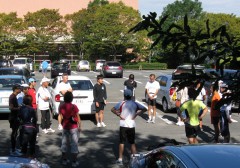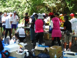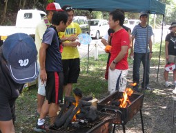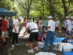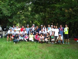 練習会は午後からのバーベキュー大会があるため集合場所は天ケ瀬ダム下吊り橋北側に9:30集合でした。幹事の方は8時から場所取りをされていたようです。参加人数は最後の夏休み週とあって少なめの25名弱が集まりました。バーベキュー大会買い出し組と練習組に分かれての行動です。練習組は17名で林(秀)氏を中心に志津川周回コース1.4Kmを個々のペースで5〜8周走りました。 バーベキュー大会の準備で1時間で練習を切り上げていよいよバーベキューの開始です。 参加者は31名と盛り上がり大量の食材、アルコールは買い取りも含めすべて使い切りました。