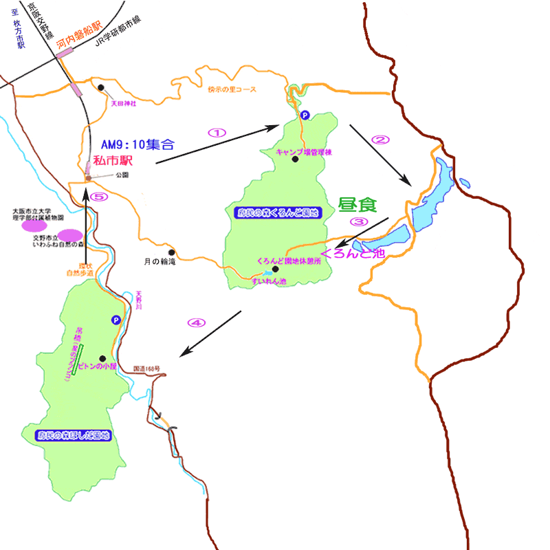 | ☆京阪交野線私市駅AM9時10分集合 北上し、天田神社9時30分、 右折獅子窟展望台経由くろんど園地入り口10時40分、左折少し行ってWCもう少し行って右折し湿原を通過、 そのまま直進突き当りを左折でくろんど池で昼食11時40分〜12時20分、 来た道を戻り園地休憩所へ向かうそこで左折しほしだ園地の方向へ、 ゴルフ場の駐車場を通って道路を下ると交差点を渡り橋を渡ると直ぐに「おじいさんの古時計」(軽食をやってる店) そこを通りすぎ少し先の磐船神社へ見学後、今来た道を戻り「おじいさんの古時計」の向かいの道を入り、 少し行くとほしだ園地に入る。 ほしだ園地に入れば左折、星のブランコめざします。(環状自然歩道コースで私市まで行ける) ピトンの小屋を左折40分で私市にゴールおよそ3時40分の予定です。(解散:4:00頃) 雨の場合、中止です。小雨で判断がつかない場合、最初のコースを月の輪滝コースで行きます。 尚、昼食は食堂(くろんど池)があります。 京阪宇治から私市まで1時間かかるので8時9分?の電車に乗らないと遅刻します。 こんなもん?地図は当日渡します。 芝田会長 作成 |